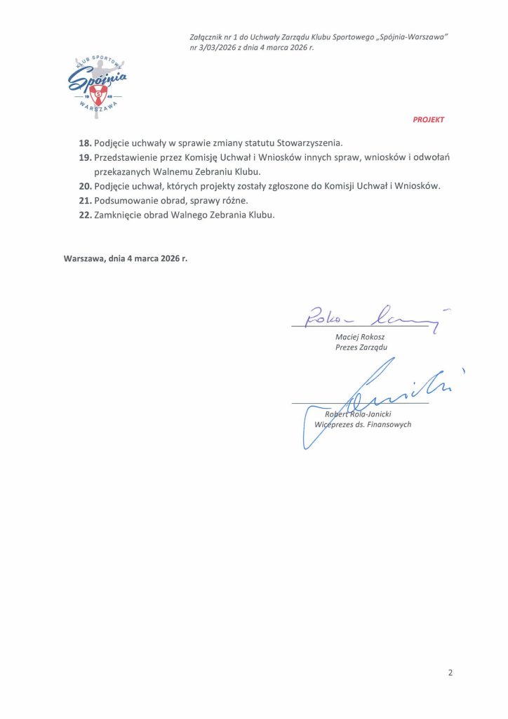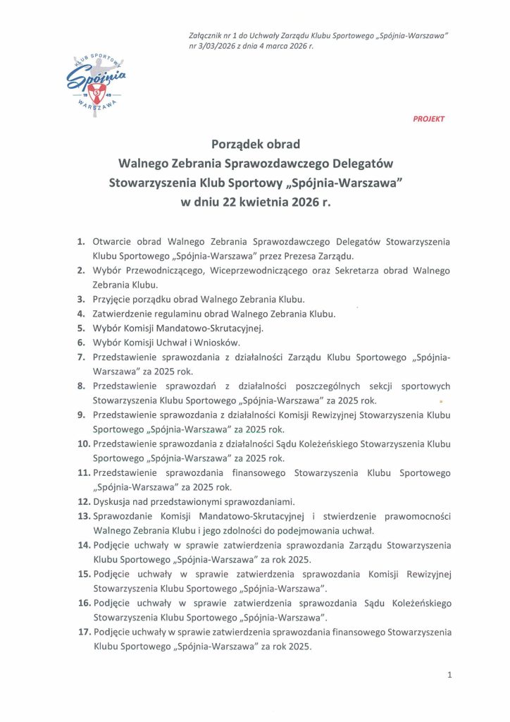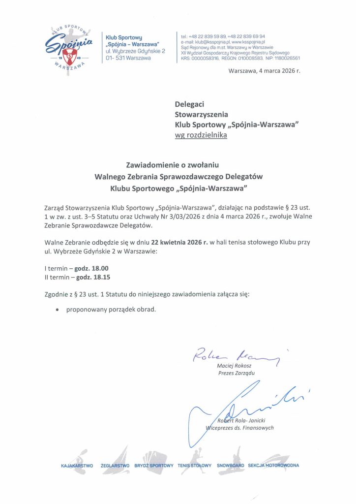 Zawiadomienie o zwołaniu Walnego Zgromadzenia Sprawozdawczego Delegatów K.S. „Spójnia-Warszawa” 22.04.2026